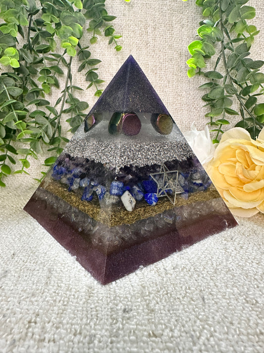 STELLA - Orgonite Pyramid - EMF Protector - Rainbow Hematite, Amethyst, Lapis Lazuli, Aura Quartz with Aluminum and Brass Metals