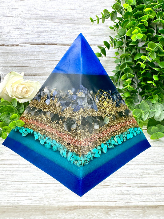 SAMANTHA - Orgonite Pyramid - EMF Protector - Sodalite, Labradorite, Turquoise and Brass Metals