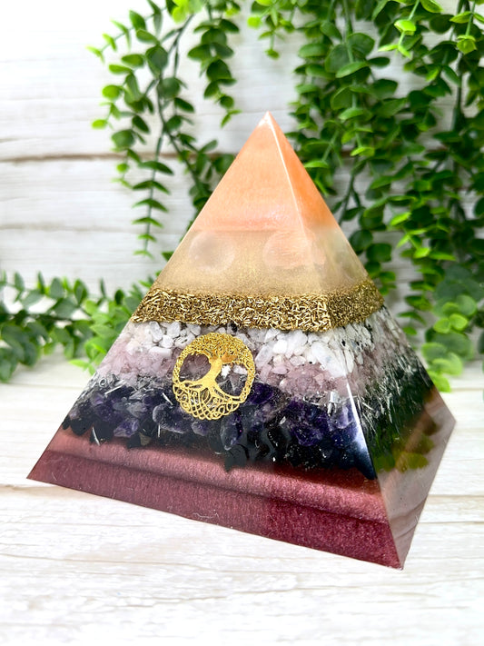 FERTILITY - Orgonite Pyramid - EMF Protector - Amethyst, Milky Quartz, Larimar, Moonstone, Lepidolite & Rose Quartz with Aluminum and Brass Metals