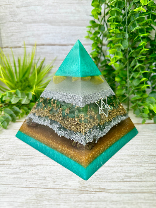 GIA - Orgonite Pyramid - EMF Protector - Tree Agate, Green Fluorite, Chrysoprase, Pyrite and Brass Metals