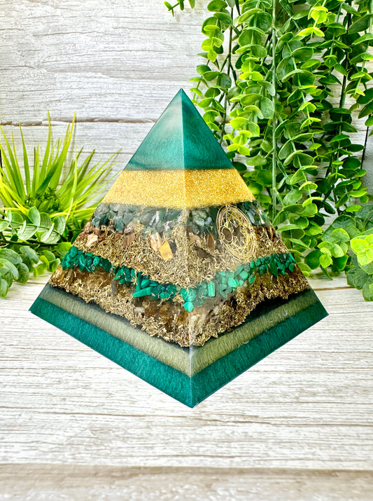 SERENITY Orgonite Pyramid - EMF Protector - Green Opal, Green Jade, Green Aventurine, Green Fluorite, DragonBlood Jasper with Aluminum and Brass Metals