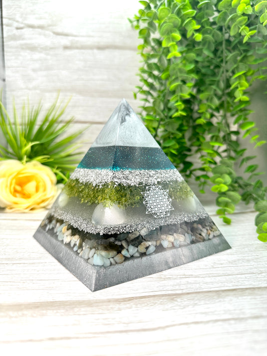 AXEL - Orgonite Pyramid - EMF Protector - Peridot, Selenite, Labradorite & Amazonite with Aluminum Metals