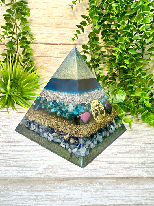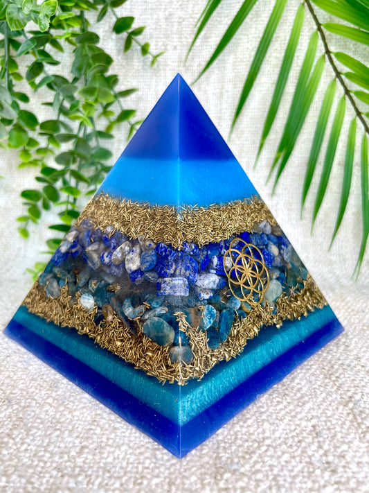 SEAN - Orgonite Pyramid - EMF Protector - Lapis Lazuli and Blue Apatite with Brass Metal