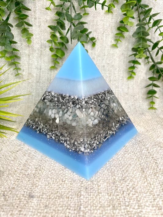 AZUL - Orgonite Pyramid - EMF Protector - Aquamarine Crystal and White Quartz with Aluminum Metal