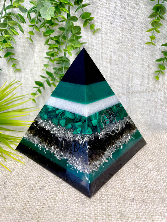 ATLAS - Orgonite Pyramid - EMF Protector - Malachite Crystal, Smoky Quartz with Aluminum Metal
