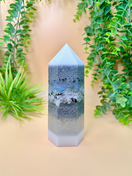 CHILDREN & CREATIVITY - Orgonite Tower - EMF Protector - Opalite, Moonstone & White Quartz with Aluminum Metals