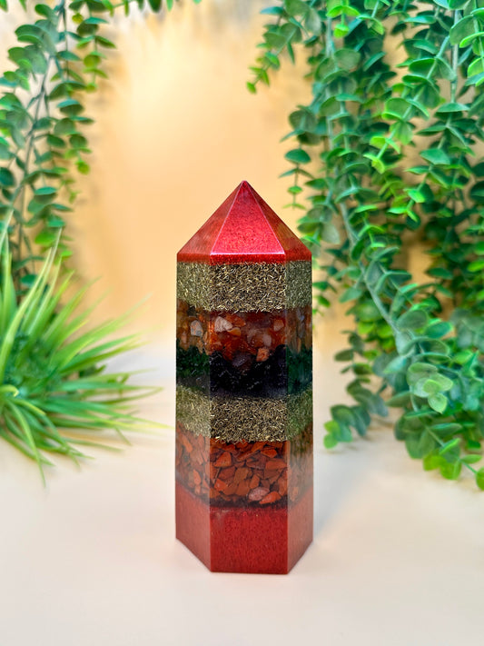 FAME & REPUTATION - Orgonite Tower - EMF Protector - Carnelian, Garnet & Red Jasper Brass Metals