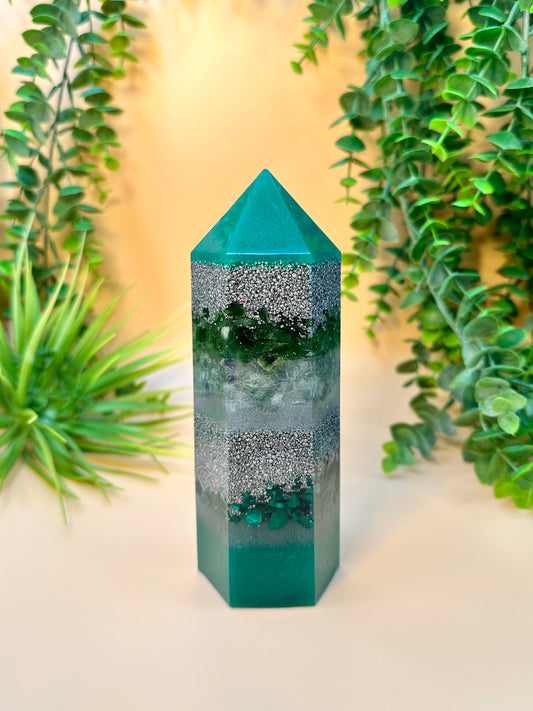 FAMILY - Orgonite Tower - EMF Protector - Green Jade, Green Fluorite, Malachite with Aluminum Metals