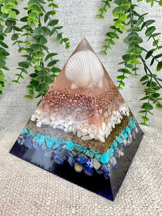 DORIS - Orgonite Pyramid - EMF Protector - Peach Moonstone, Sea Shells, Turquoise, Lapis Lazuli, with Copper and Brass Metals