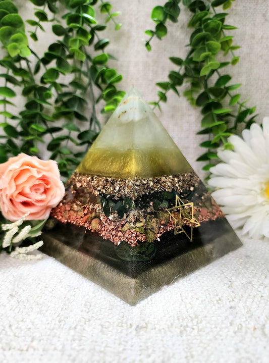 NOVA - Orgonite Pyramid - EMF Protector - Chrysoprase, Green Jade, Unakite and Bloodstone with Brass and Copper Metals