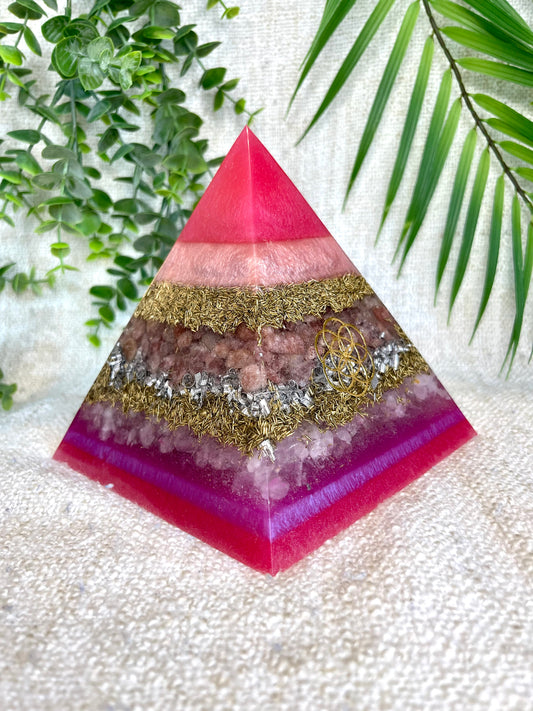 SABRINA - Orgonite Pyramid - EMF Protector - Strawberry Quartz and Rose Quartz with Brass and Aluminum Metal