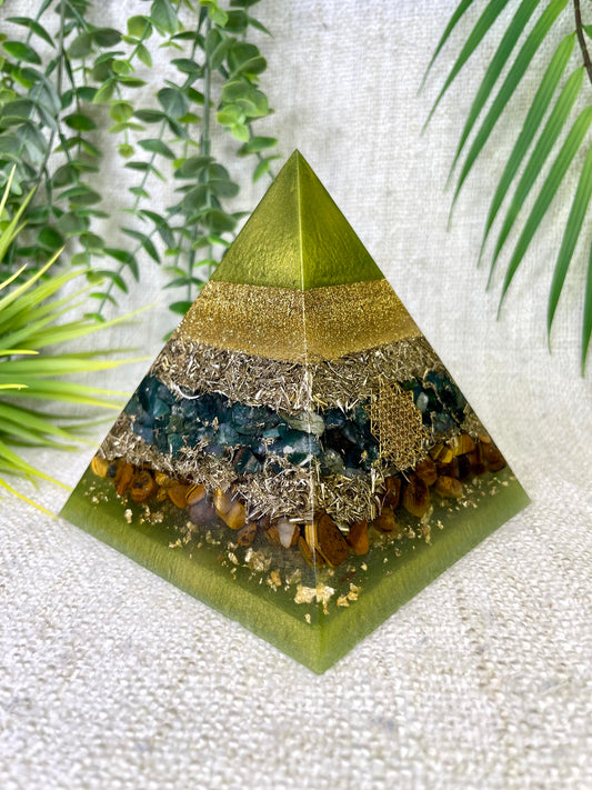 BETH - Orgonite Pyramid - EMF Protector - Moss Agate, Tiger's Eye and Brass metals