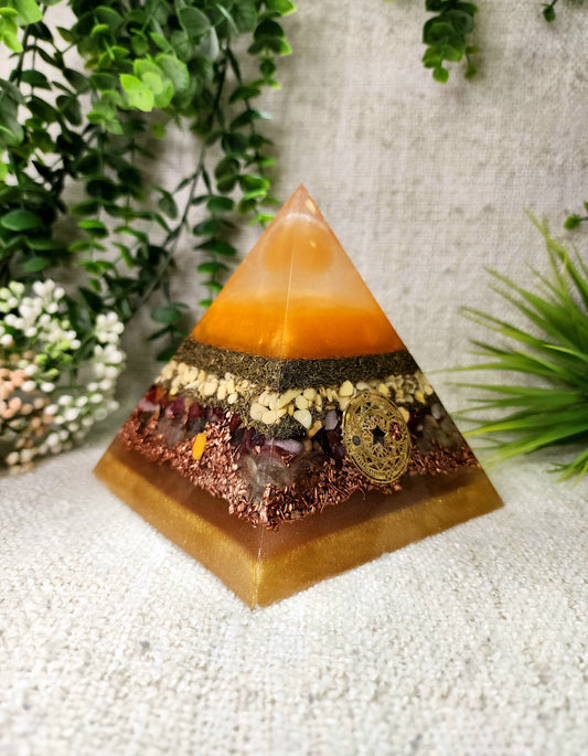 EDITH - Orgonite Pyramid - EMF Protector - Orange Selenite, Yellow Aventurine, Mookaite and Citrine with Brass and Copper Metals