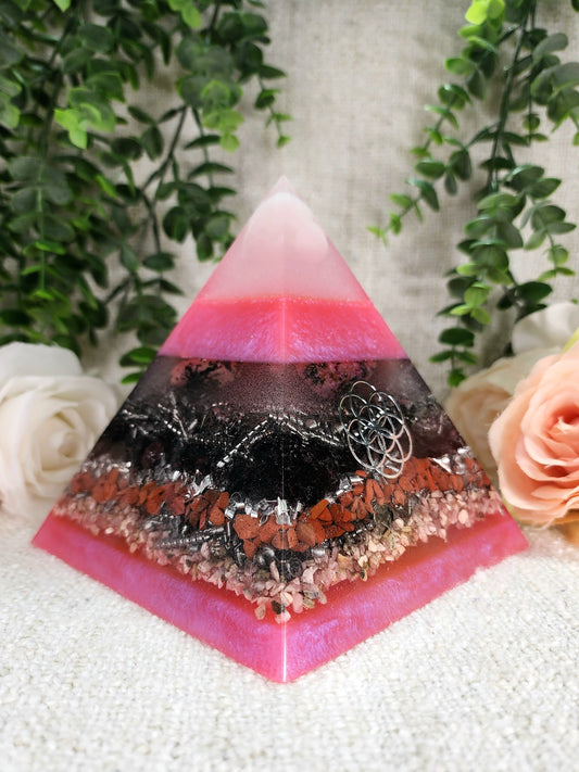 INANNA - The Love Collection Orgonite Pyramid - EMF Protector - Rose Quartz, Rhodonite, Garnet, Red Jasper, Rhodochrosite, Stainless Steel and Aluminum Metal