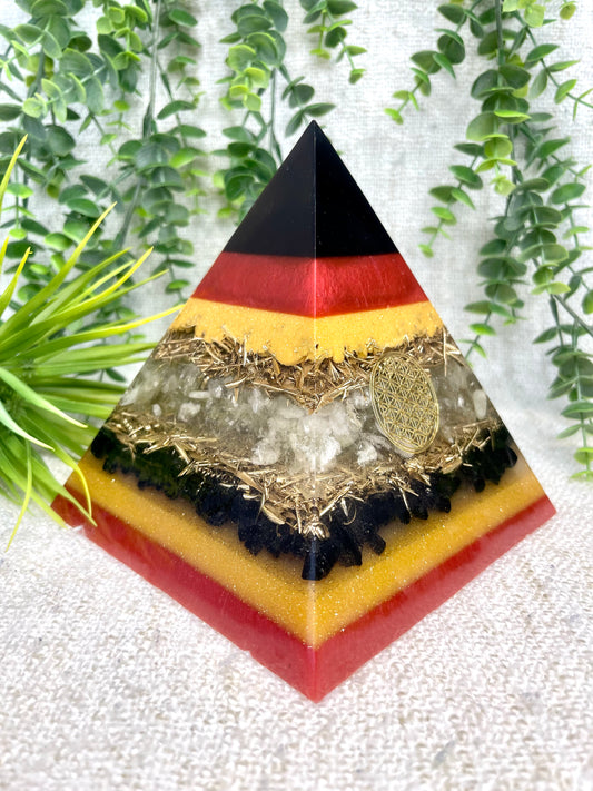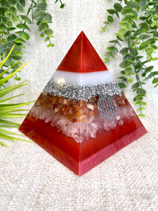 ROSA- Orgonite Pyramid - EMF Protector - Carnelian & White Quartz and Aluminum Metal