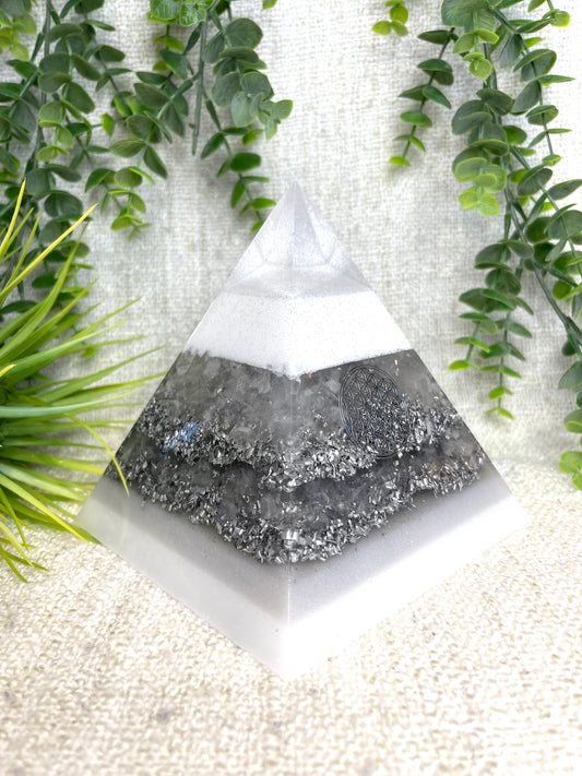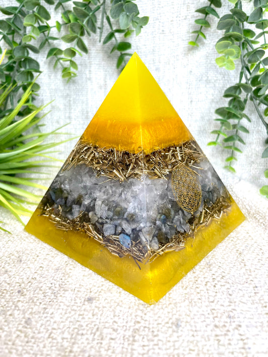 PAOLA- Orgonite Pyramid - EMF Protector - White Quartz, Labradorite Quartz and Brass Metal
