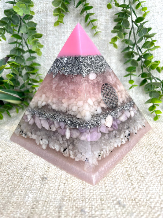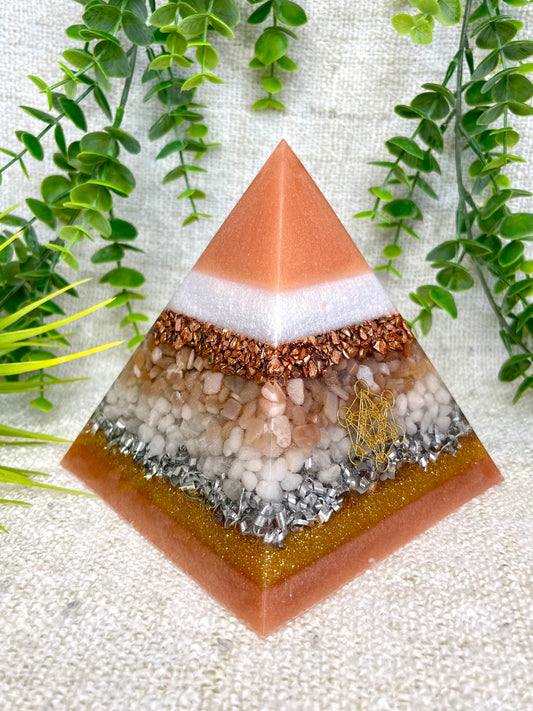 GEORGIA - Orgonite Pyramid - EMF Protector - Peach Moonstone, White Milky Quartz and Copper with Aluminum Metals