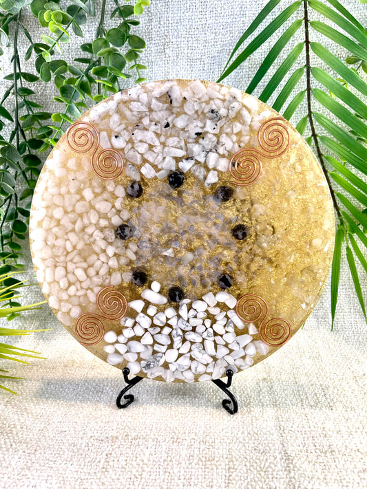 Clearing Orgonite Charging Plate - EMF Protector - White Quartz, White Milky Quartz, Howlite and Moonstone with Brass Metals