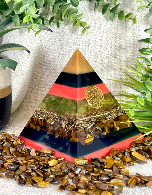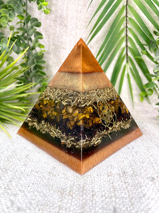 ETHAN - Orgonite Pyramid - EMF Protector - Tiger's Eye, Garnet and Brass Metals