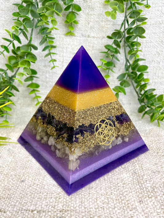 CHARLOTTE - Orgonite Pyramid - EMF Protector - Amethyst with Citrine and Brass Metals