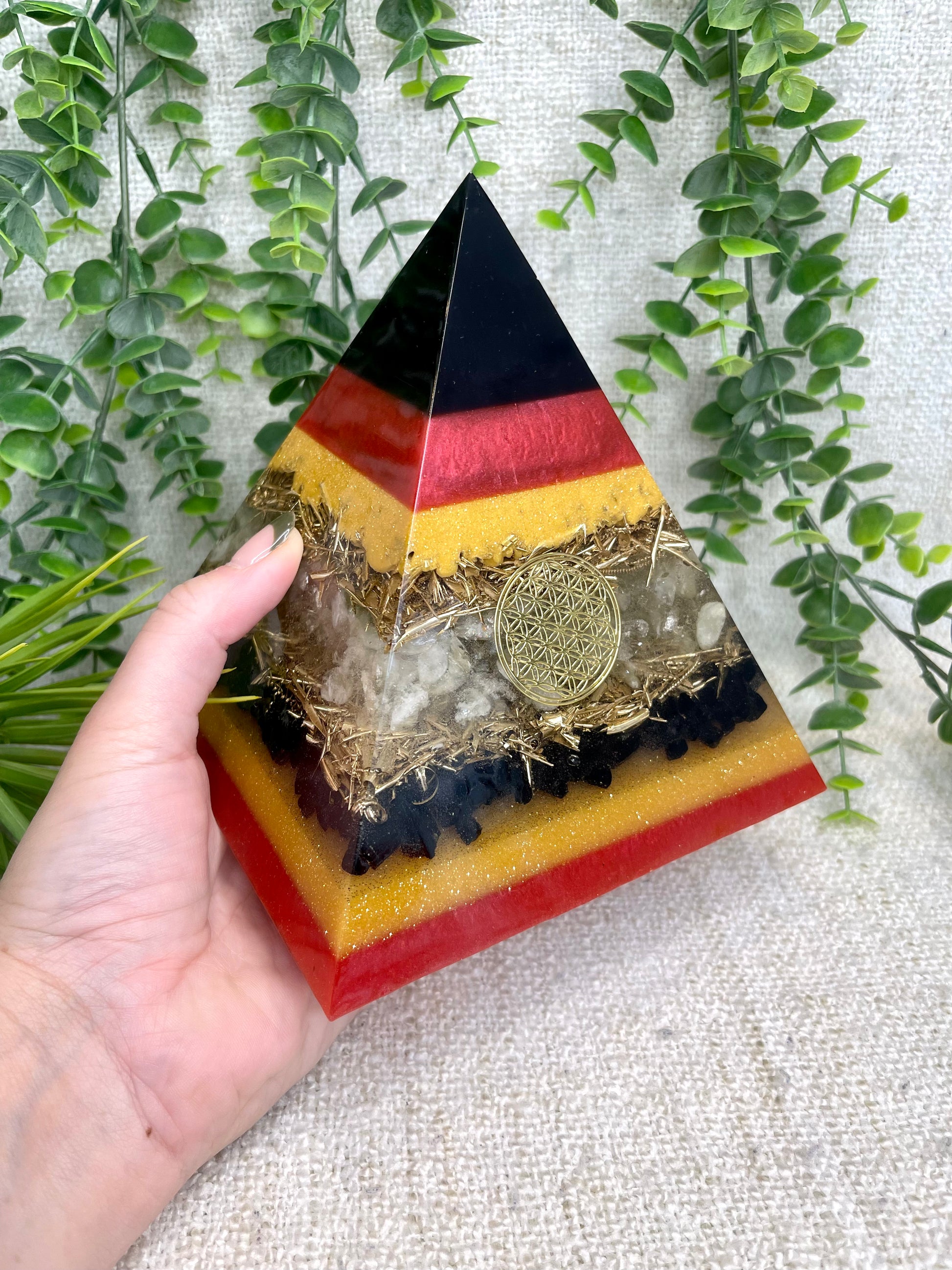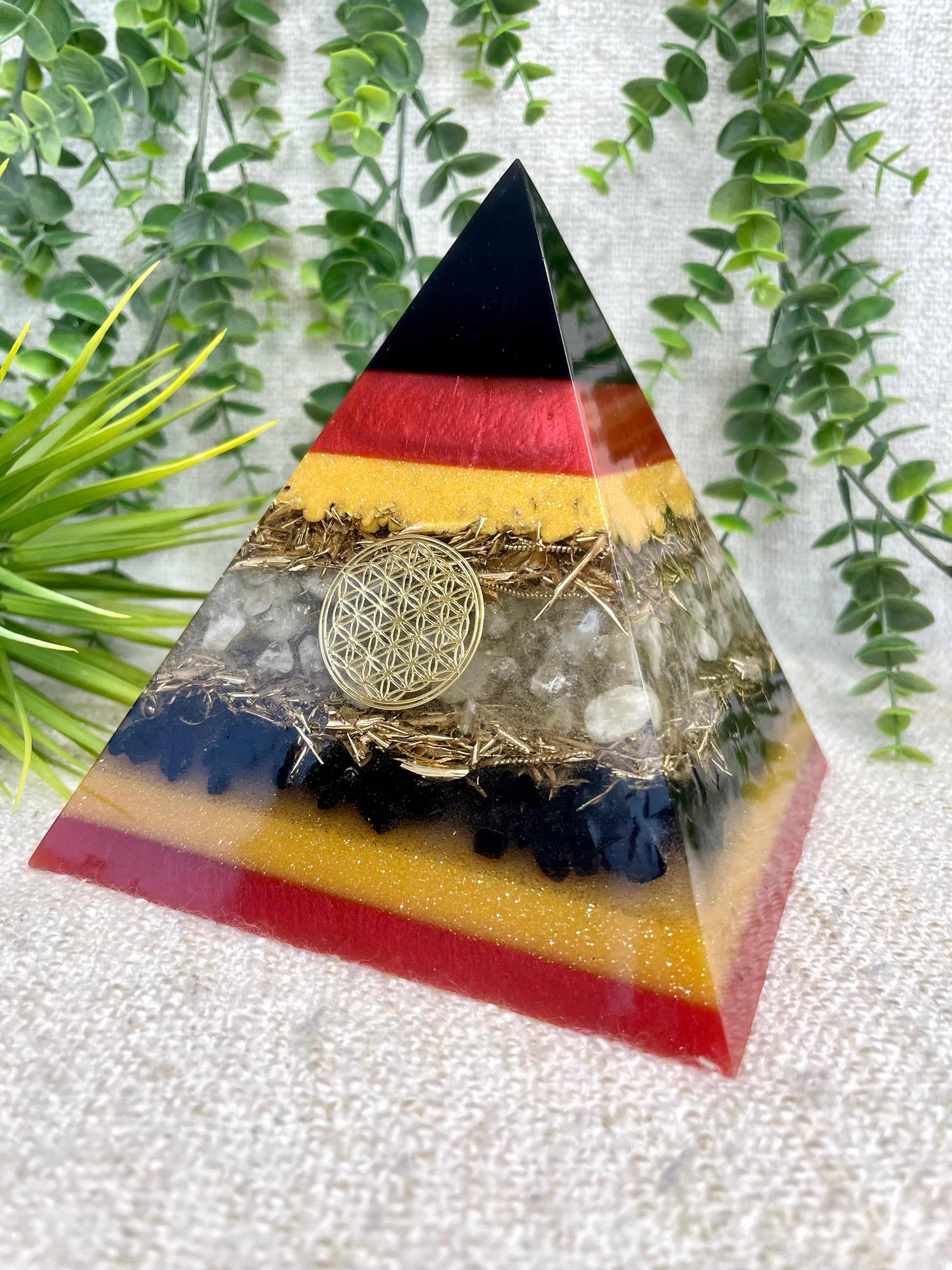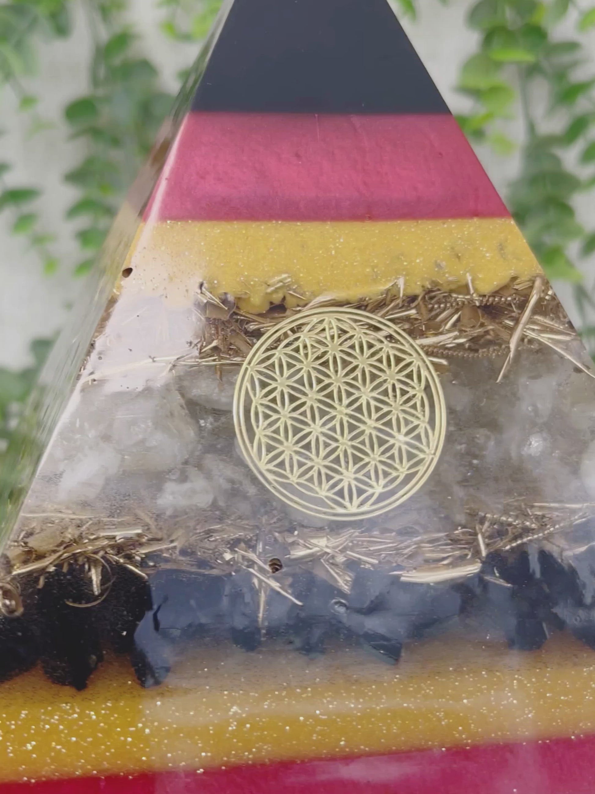 This Beautiful Orgonite Pyramid is made of Citrine crystal, Black Tourmaline and Brasa metal. It is a collaboration with Sherri Divband from The Aramis Collective. This piece is handmade with love and light and in the highest frequency possible! We named this design SKYLER and it is unique in every way, there is no other one like it, so please bare in mind when you order, yours might not look exactly like it, but very similar!