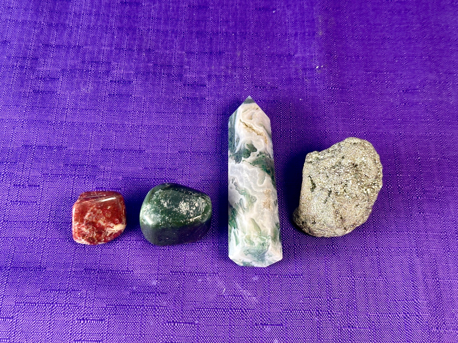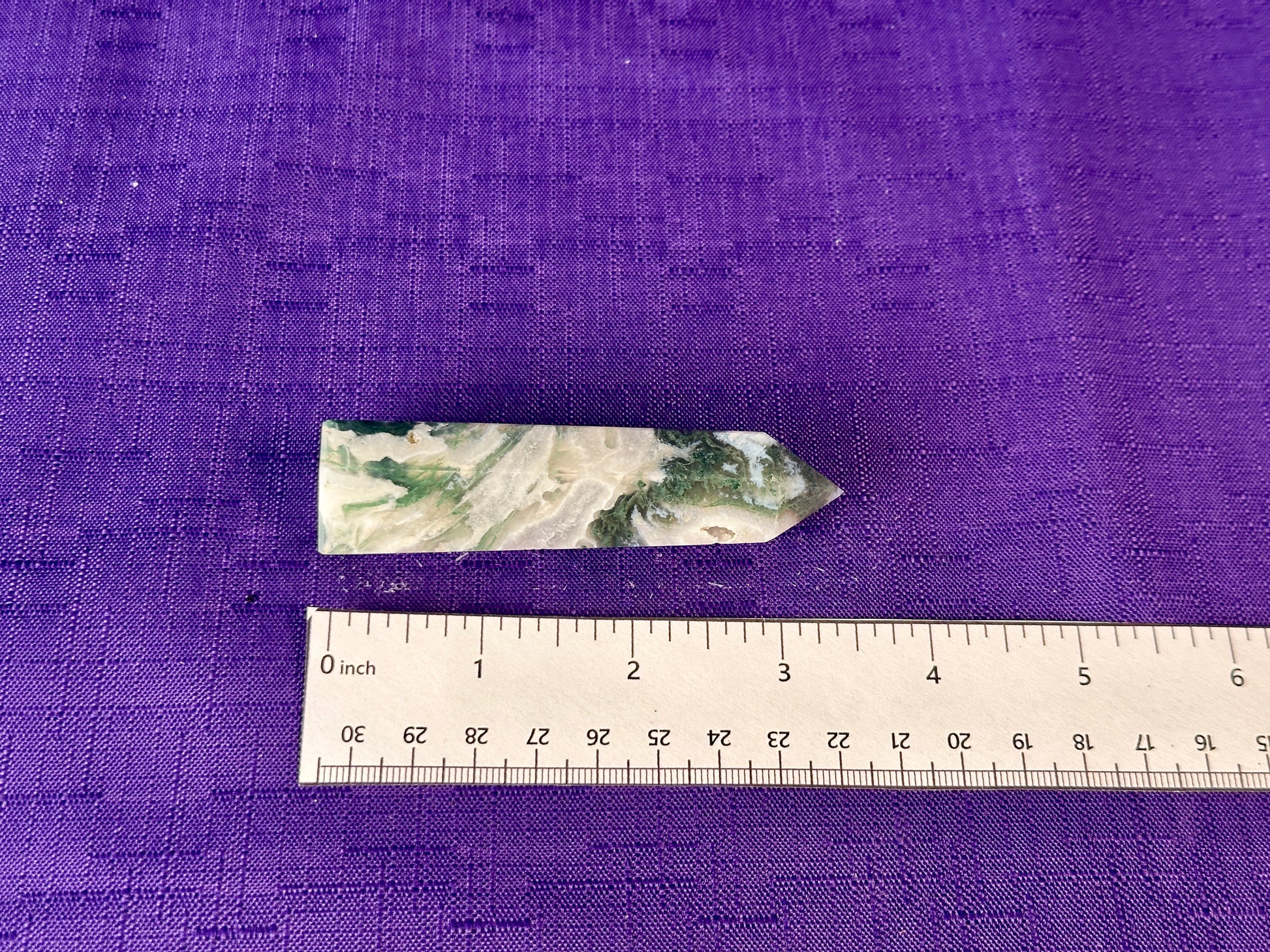 Moss Agate: Attracts growth and prosperity by aligning you with the natural flow of abundance and opportunity. Approximately 2.75" - 3.5" Tall. Origin: India.