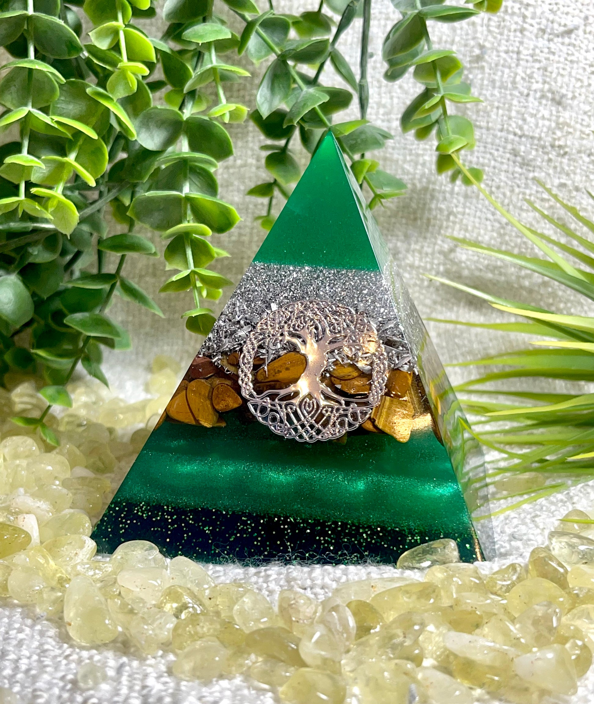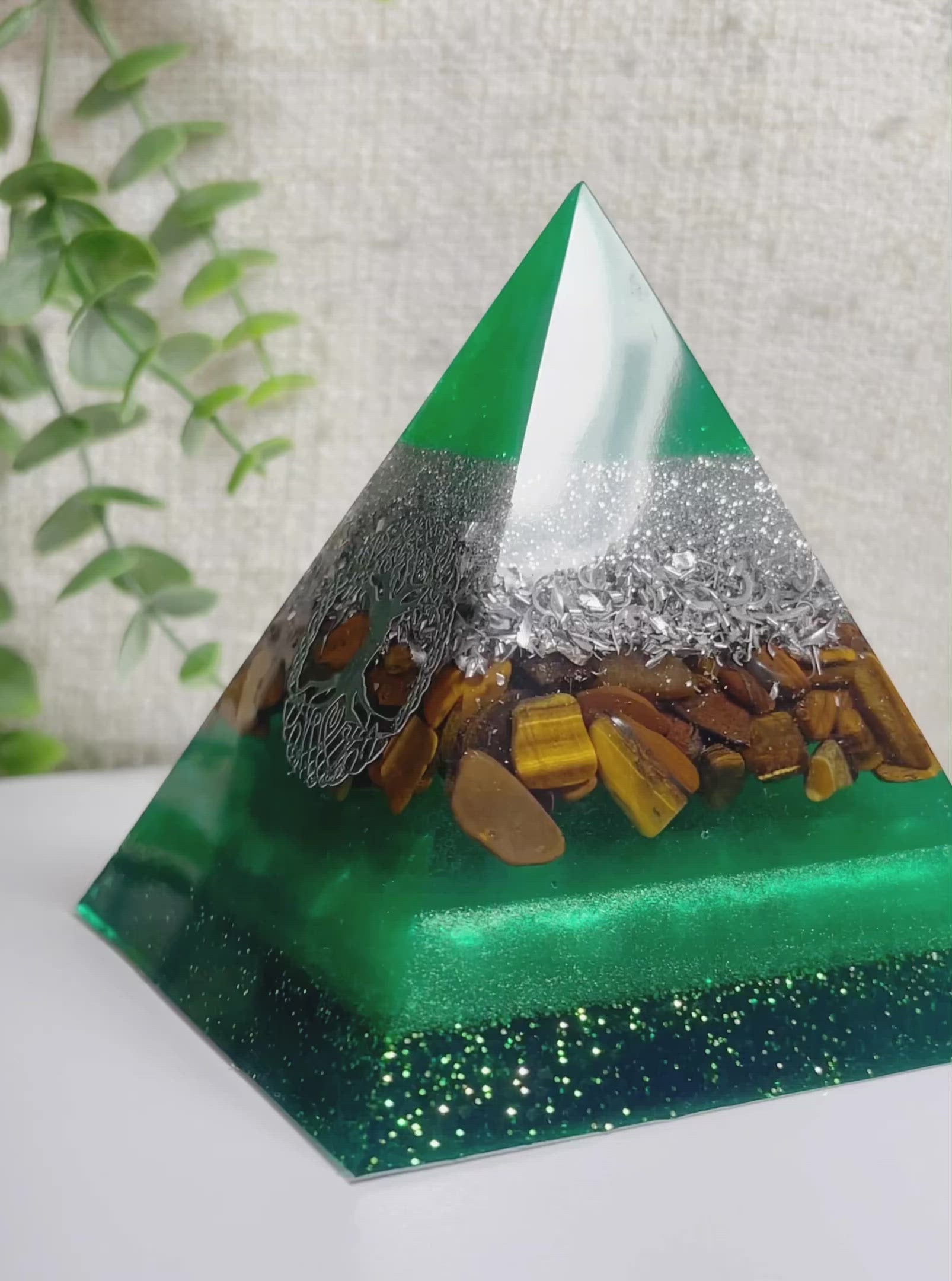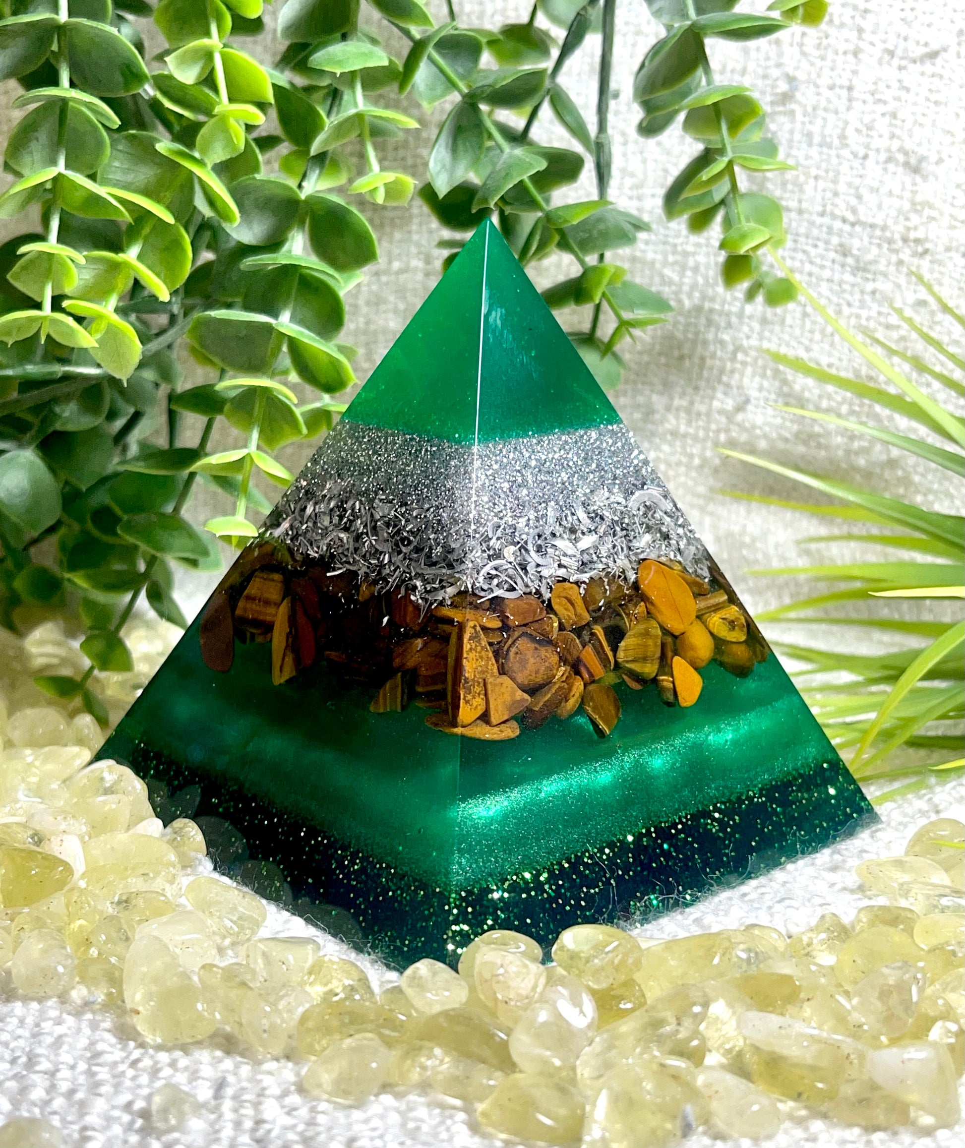 ESMERALDA - Orgonite Pyramid - EMF Protector - Tiger's Eye Crystal and Aluminum Metal
