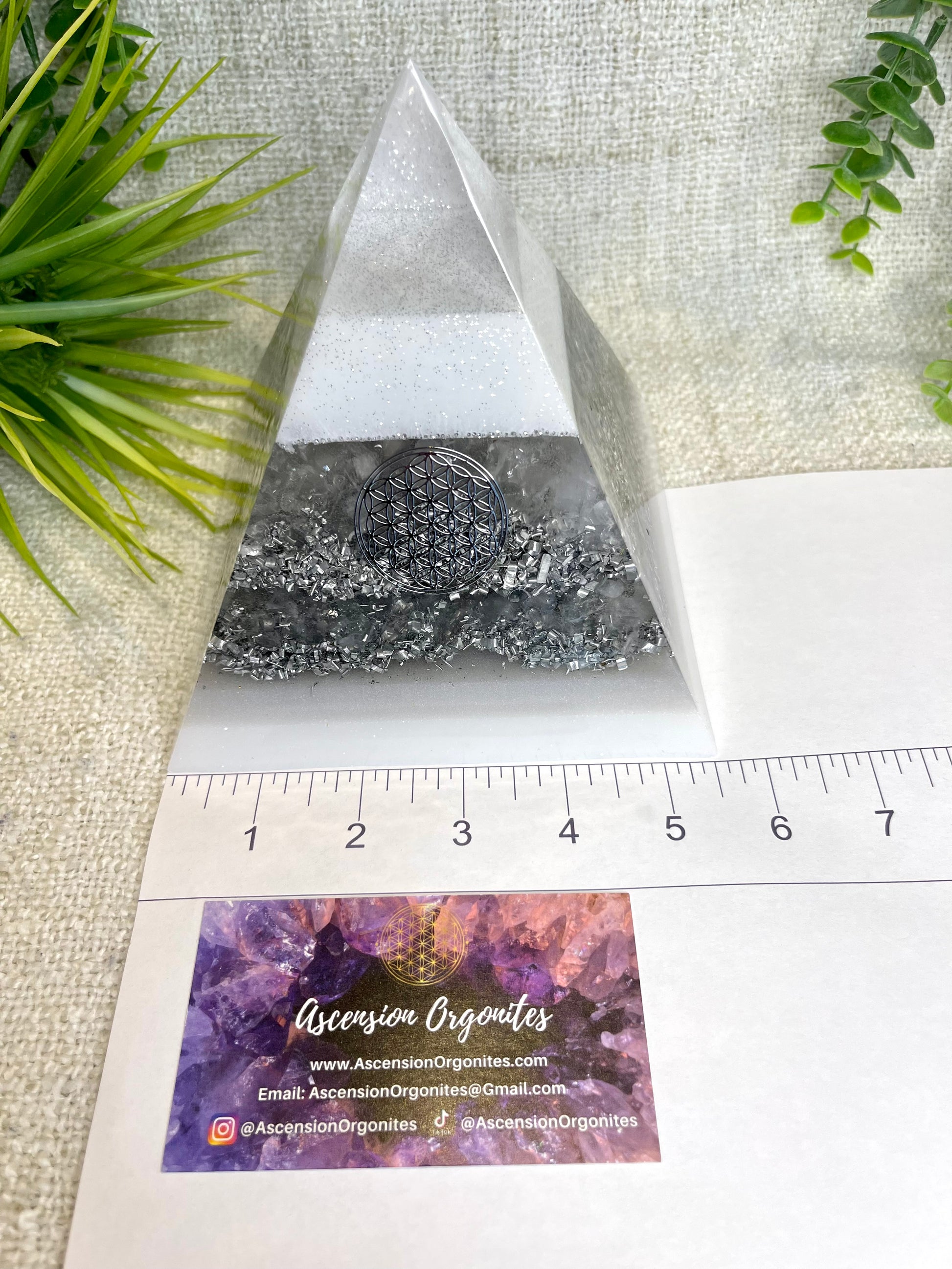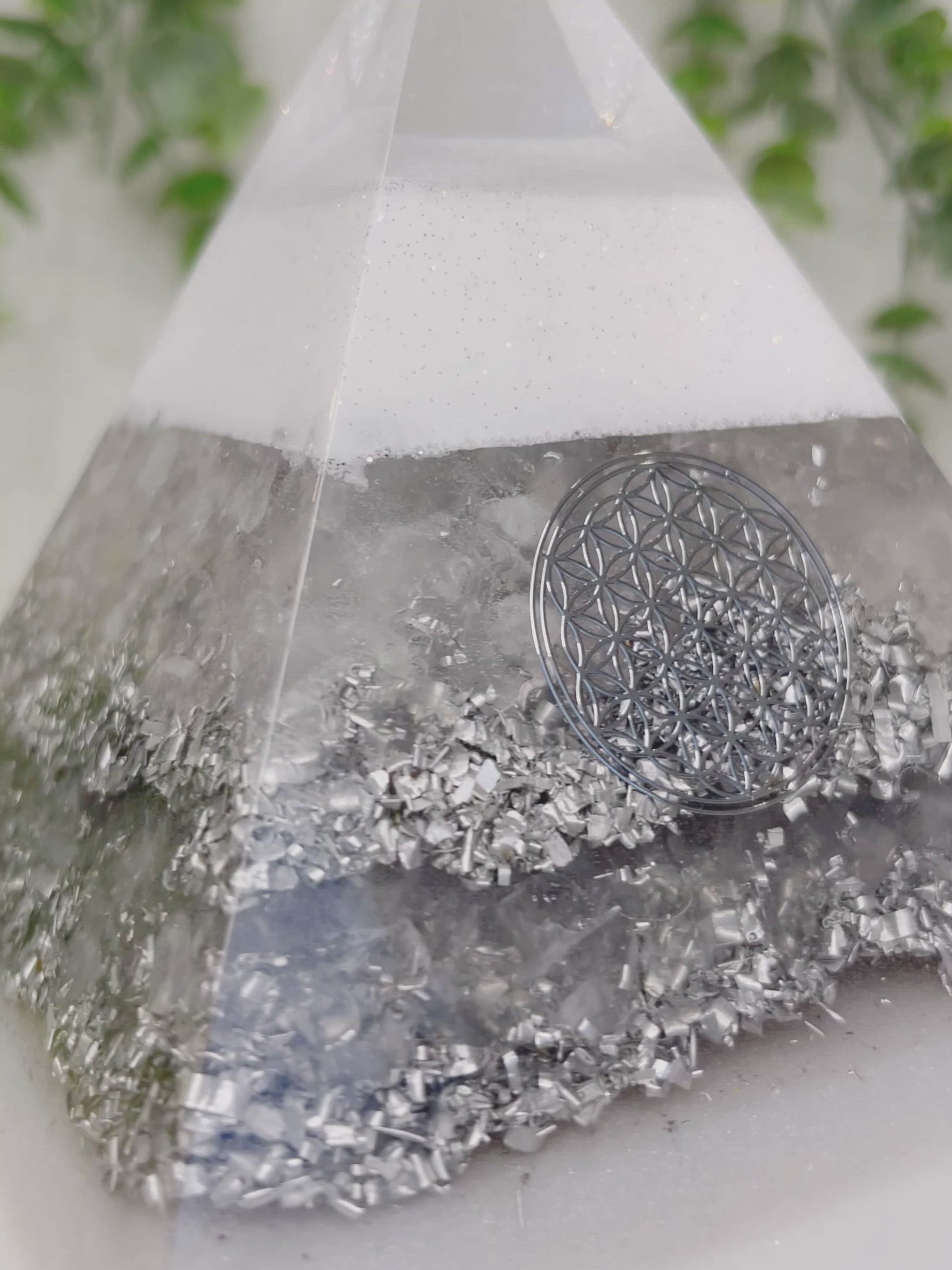 This Beautiful Orgonite Pyramid is made of White crystal quartz and Aluminum metals. It is handmade with love and light and in the highest frequency possible! We named this design MONICA and she is unique in every way, there is no other one like it, so please bear in mind when you order, yours might not look exactly like it but very similar!