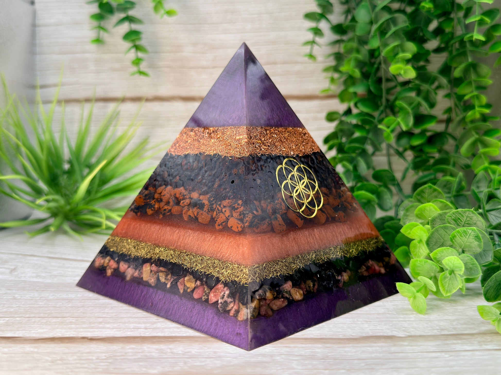 ORION - Orgonite Pyramid - EMF Protector - Garnet, Mahogany Obsidian, Shungite, Rhodonite with Copper & Brass Metals