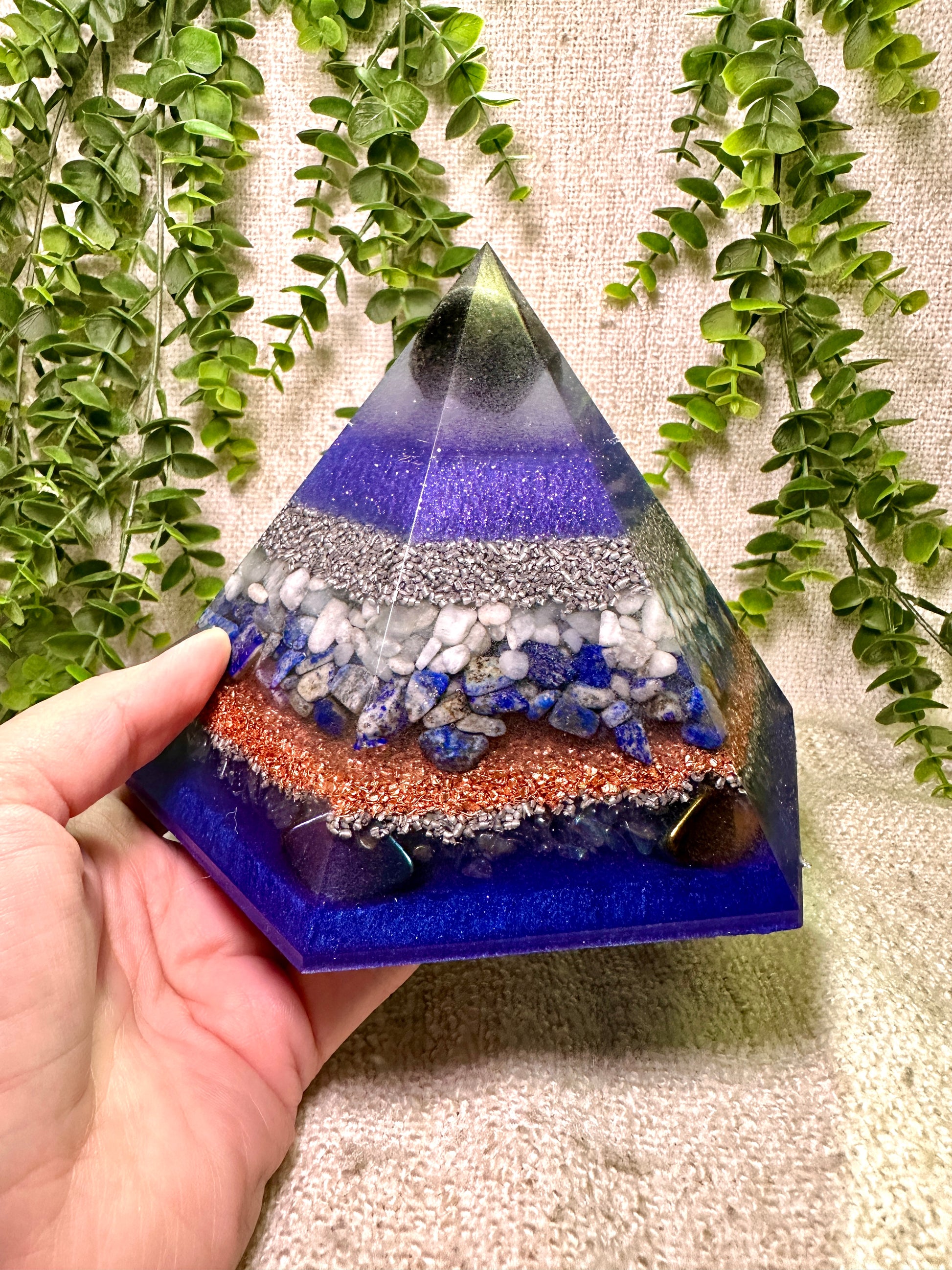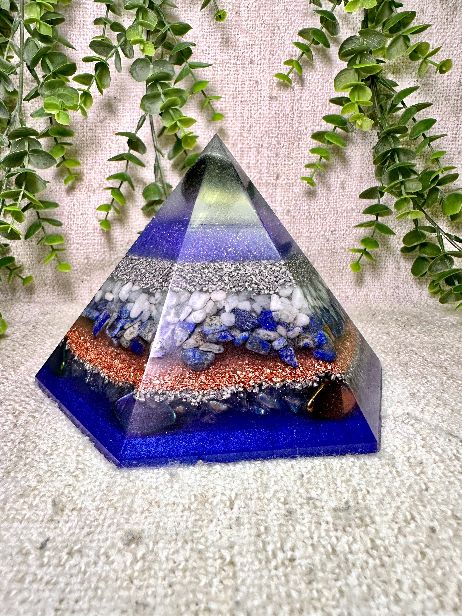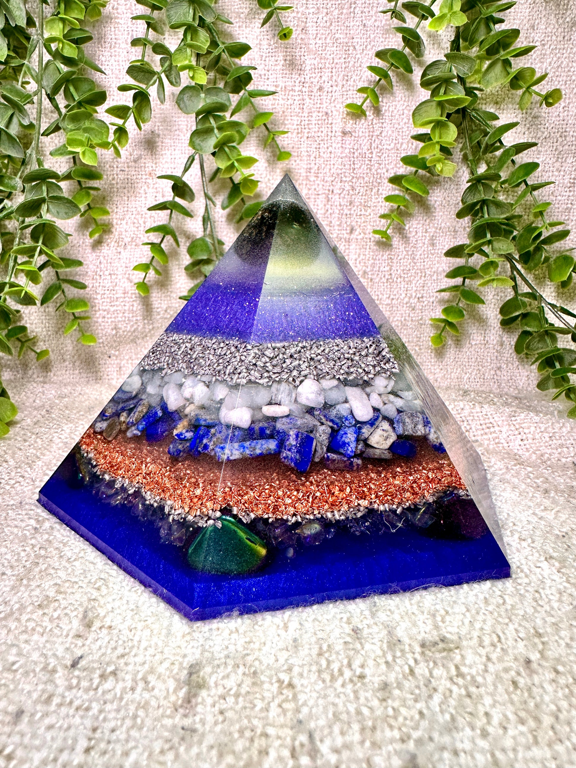 This Beautiful Orgonite Pyramid is made of Tektite, Aquamarine, Lapis Lazuli, Aura Quartz, Rainbow Hematite and Aluminum with Copper Metals. It is handmade with love and light and in the highest frequency possible! We named this design STARSEED and she is unique in every way, there is no other one like it.